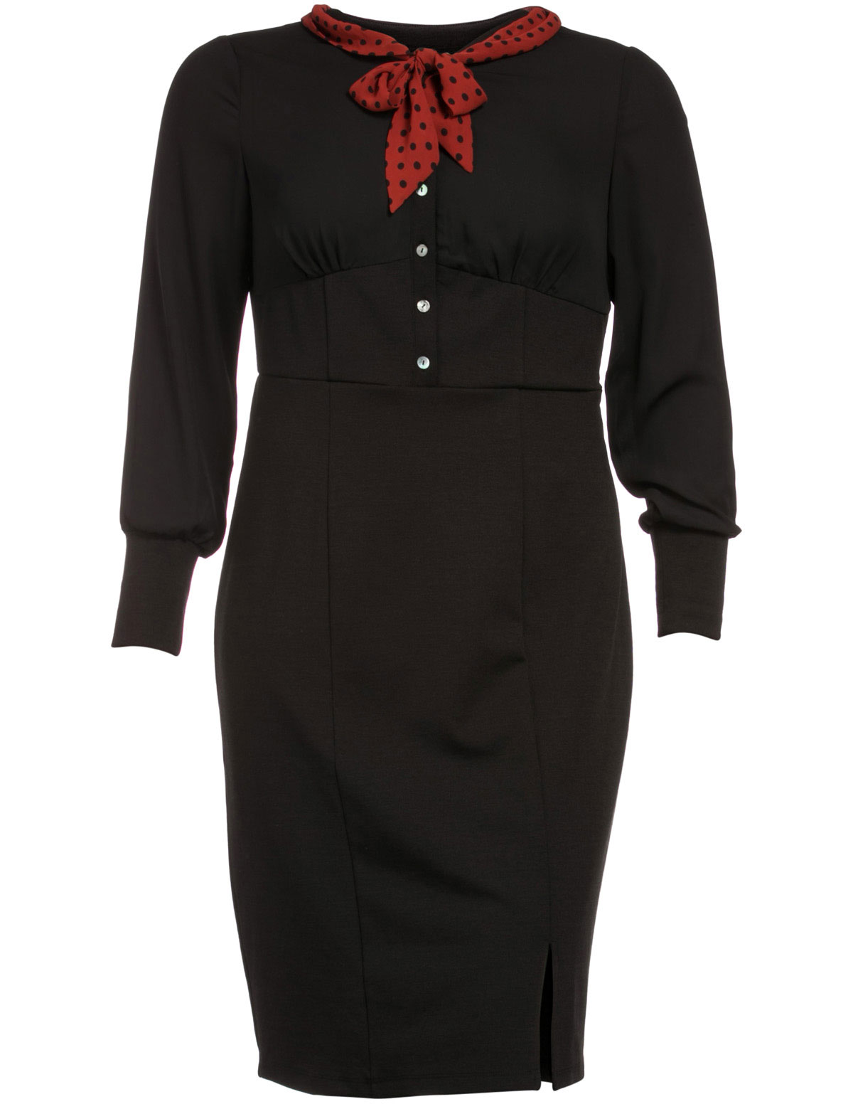 Long sleeves; buttoned serafino collar; dotted chiffon sloop; hidden zip at the left side; walking slit at the front; tailored cut; soft fabric at the sleeves; slightly thicker, opaque, smooth fabric.