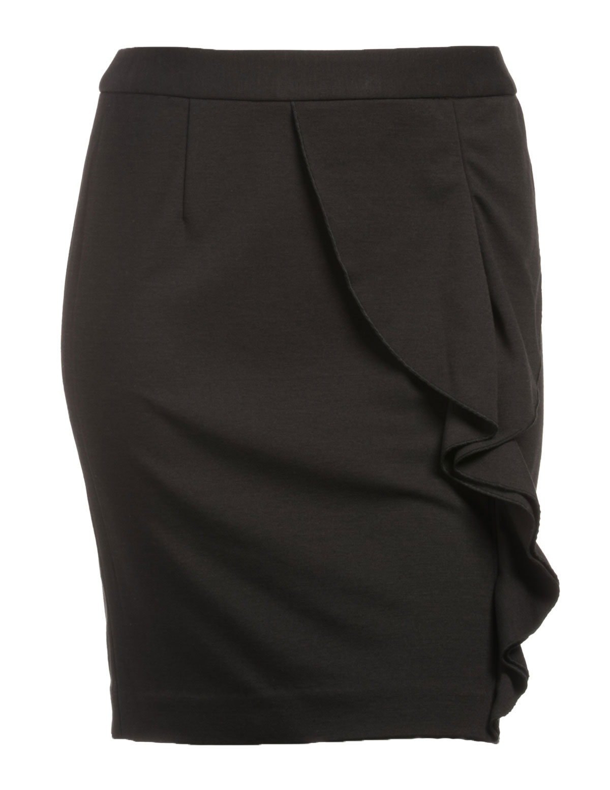 Contrasting hemline; hidden zip at the back; tailored, knee-long cut; volants at the front; thick, smooth fabric.